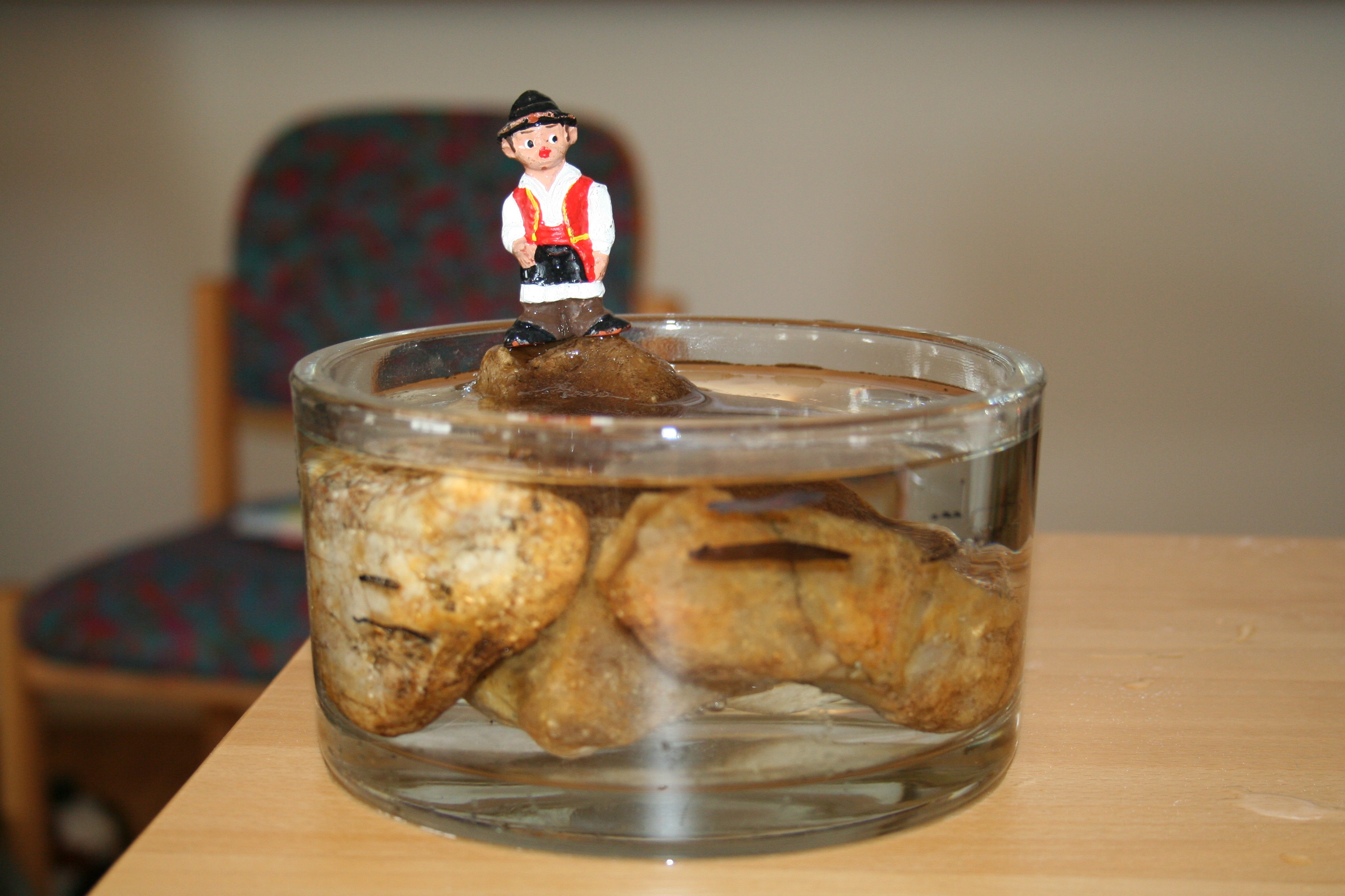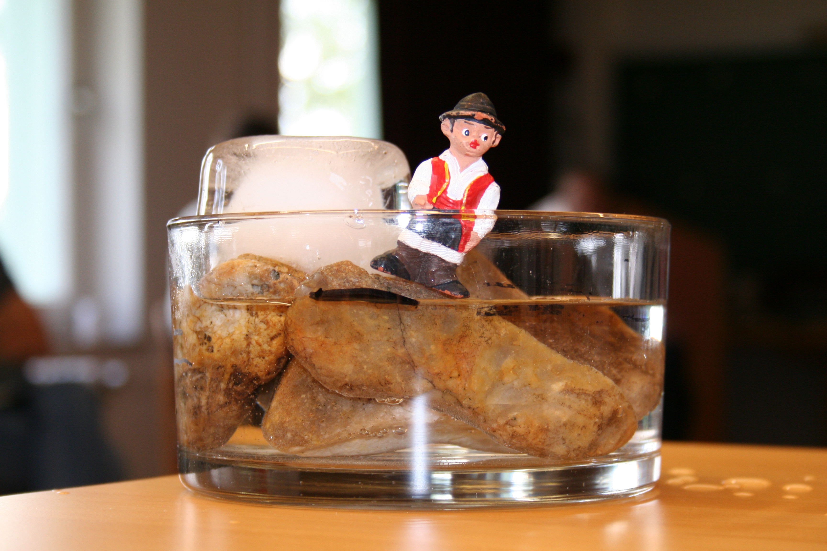 Emil, das Spielzeugmännchen, musste sich im Mini-Aquarium immer weiter auf einen Berg von Steinen retten. Während der Veranstaltung zu Klimaschutz und Energiesparen für Erzieherinnen und Erzieher schmolz ein Eisberg im Aquarium immer mehr ab. Und damit stieg der Wasserspiegel auf Emils kleiner Steininsel in dem einfachen, aber sehr anschaulichen Experiment zum Abschmelzen der Polarkappen durch den Klimawandel.